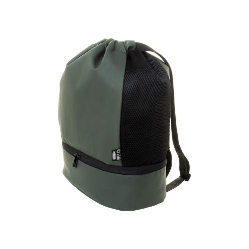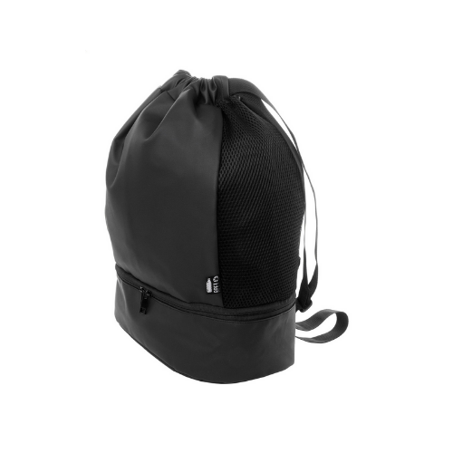 Hochwertiger RPET-Kordelzugbeutel mit Reißverschluss-Schuhfach, seitlichen Mesh-Einsätzen und breiten Trägern. Material: PU-beschichtetes 600D RPET-Polyester.
