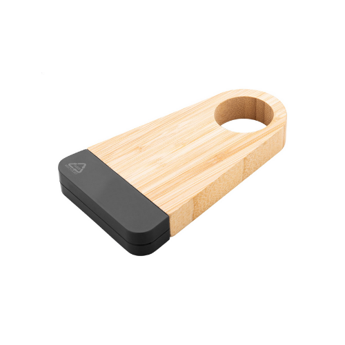 Weinflaschenhalter aus Bambus und recyceltem ABS mit Korkenzieher aus Edelstahl.