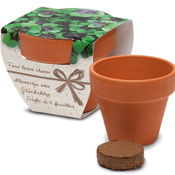 Dieses charmante Pflanzset enthält einen Terrakotta-Topf (Ø 55 mm), eine Kokostablette und 3–4 Glücksklee-Knollen – ideal als nachhaltiges Werbegeschenk.