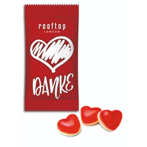 Fruchtige Himbeer-Herzen treffen auf Vanilleschaum. Die schmackhaften Herzen werden im inividuell bedruckbaren Flowpack angeboten.
