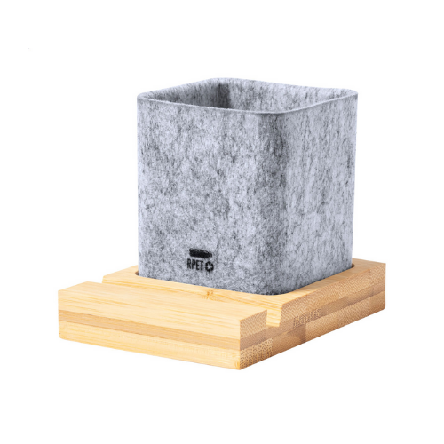 Schreibtisch-Organizer aus Bambus mit Handyhalter und Stifteköcher aus RPET Filz.