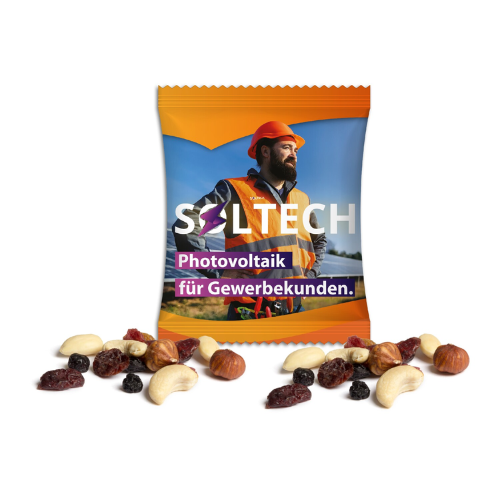 Knackig süße Kombination aus getrockneten Blaubeeren, Cranberries, Kirschen und Sultaninen sowie Cashewkernen, Haselnusskernen und blanchierten Mandeln aus dem Hause Seeberger, verpackt im individuell bedruckten Werbetütchen.