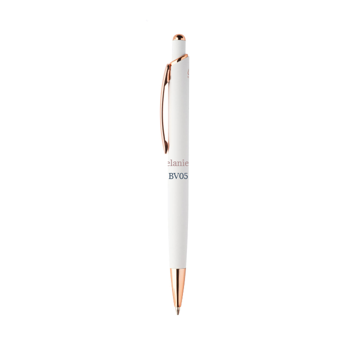 Kugelschreiber aus recyceltem Aluminium mit gummierter Oberfläche und rosagoldenen Elemnten Mit Spezialbeschichtung für rosagoldfarbene Spiegelgravuren. Blauschreibend.