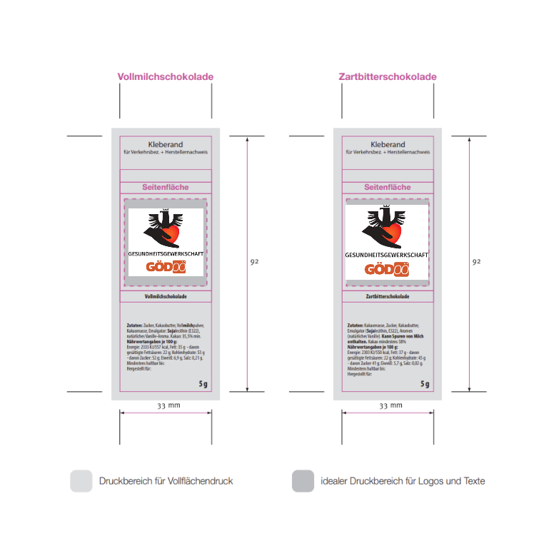 Die klassischen Täfelchen aus Vollmilch- oder Zartbitterschokolade stannioliert in individuell bedruckter Papierbanderole.